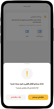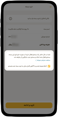 - تبصره مرحله ۶: در صورت خرید بسته جدید، اگر بیش از ۵ روز از اعتبار بسته فعلی یا بیش از ۵۰۰ مگابایت از حجم آن باقی مانده باشد، بسته جدید جایگزین بسته فعلی خواهد شد.